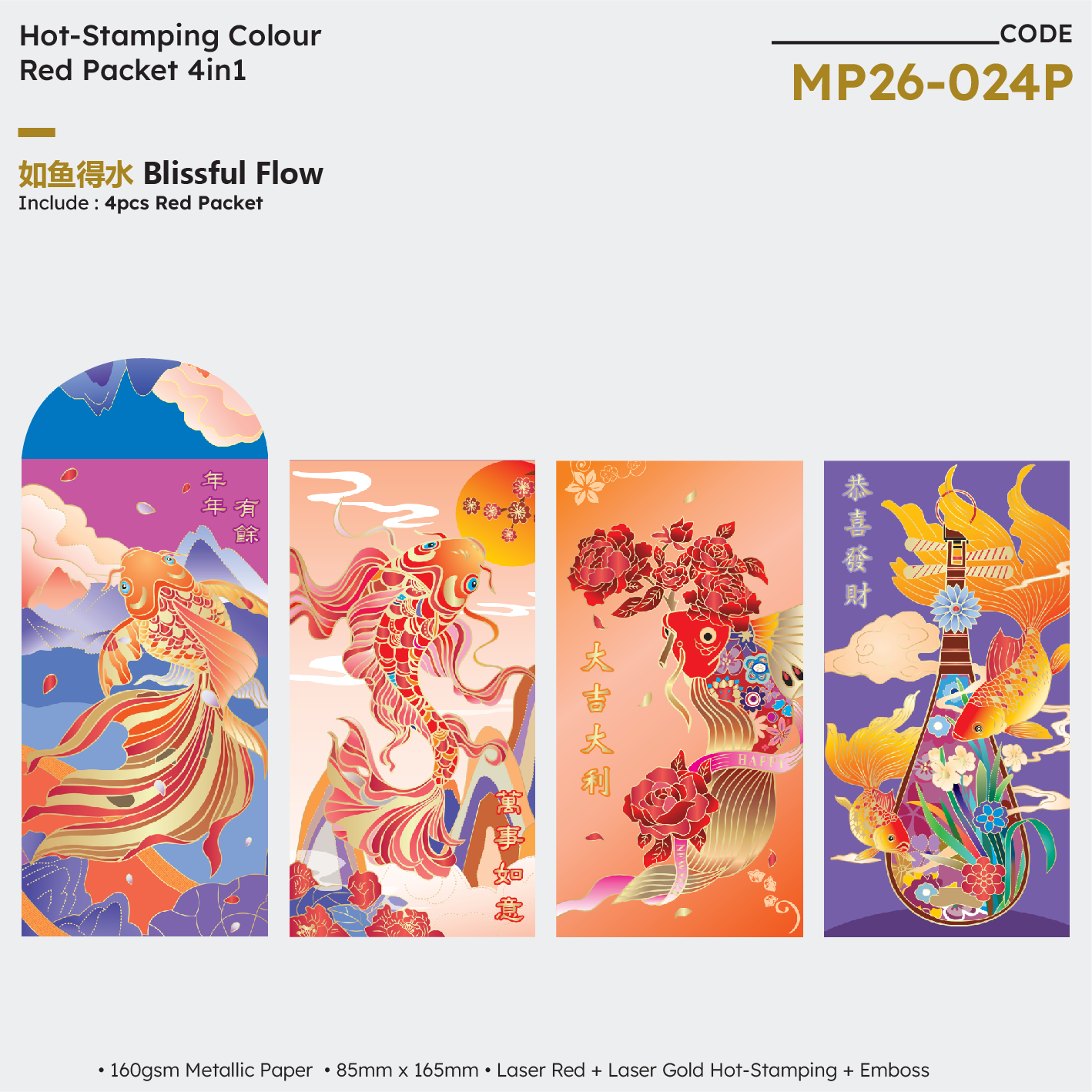 | MP26-024P Blissful Flow 4in1 | NA | NA | NA | 160gsm Metallic Paper | Laser Red Hot-Stamping + Laser Gold Hot-Stamping + Emboss | 85mm (W) x 165mm (H) | 200 packets x 4 designs | 60mm (W) × 35mm (H) |