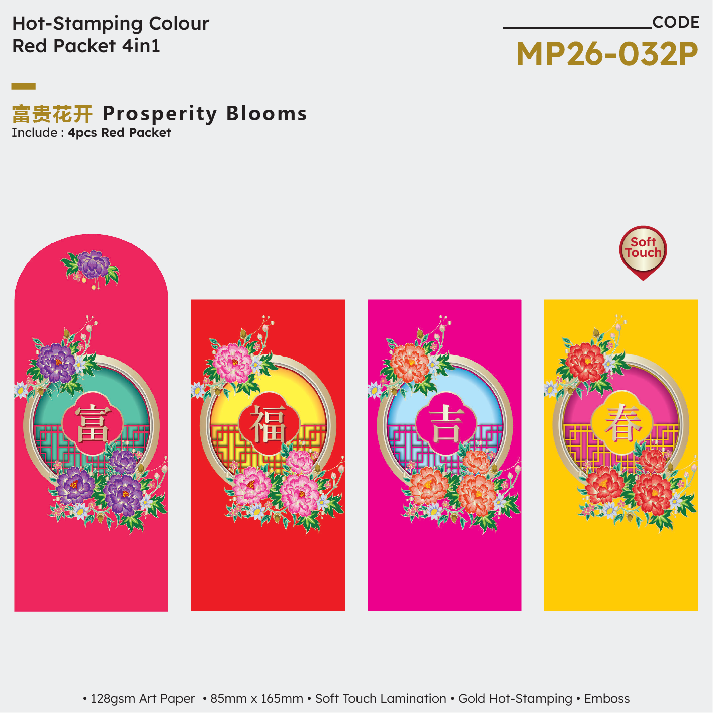 | MP26-032P Prosperity Blooms 4in1 | NA | NA | NA | 128gsm Art Paper | Soft Touch Lamination + Gold Hot-Stamping + Emboss | 85mm (W) x 165mm (H) | 200 packets x 4 designs | 60mm (W) × 35mm (H) |