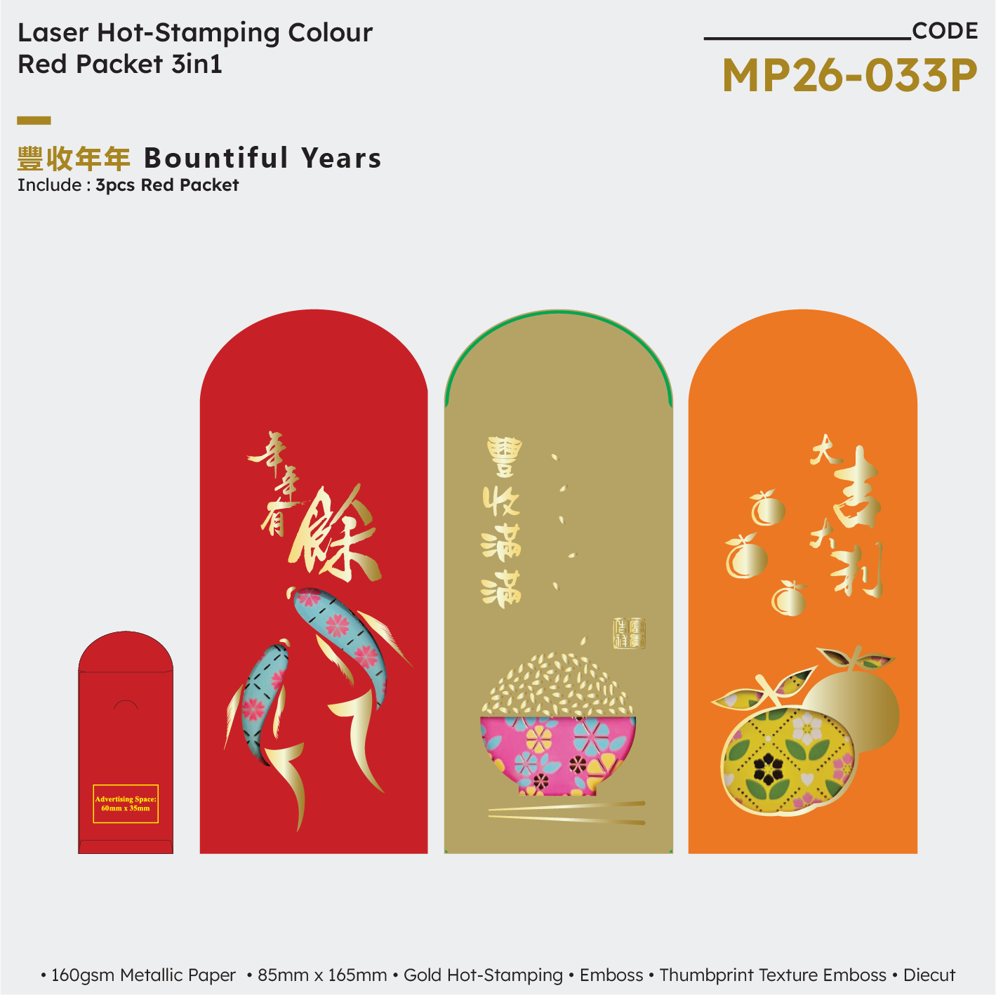 | MP26-033P Bountiful Years 3in1 | NA | NA | NA | 160gsm Metallic Paper | Gold Hot-Stamping + Emboss + Thumbprint Texture Emboss + Diecut | 85mm (W) x 165mm (H) | 200 packets x 3 designs | 60mm (W) × 35mm (H) |