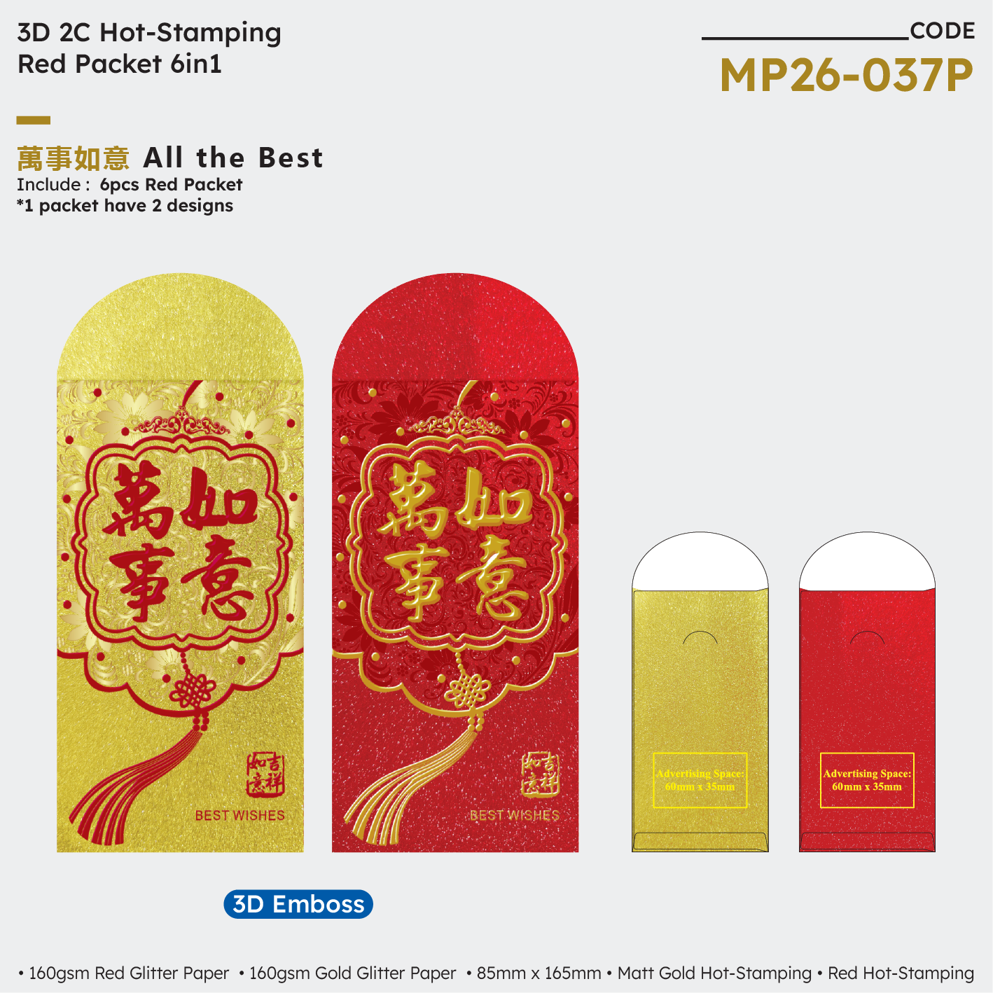 | MP26-037P All The Best 6in1 | NA | NA | NA | 160gsm Red & Gold Glitter Paper | Matt Gold Hot-Stamping + Red Hot-Stamping | 85mm (W) × 165mm (H) | 200 packets x 6 designs | 60mm (W) × 35mm (H) |