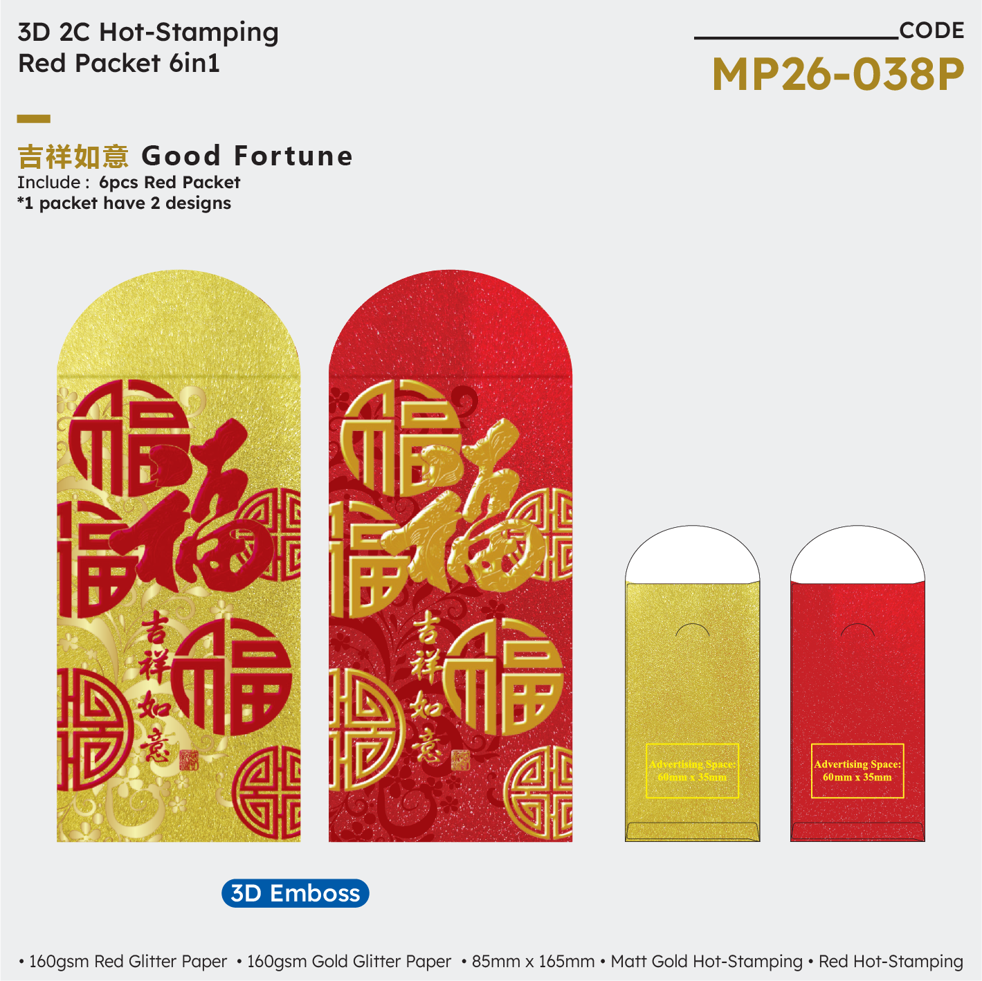 | MP26-038P Good Fortune 6in1 | NA | NA | NA | 160gsm Red & Gold Glitter Paper | Matt Gold Hot-Stamping + Red Hot-Stamping | 85mm (W) × 165mm (H) | 200 packets x 6 designs | 60mm (W) × 35mm (H) |
