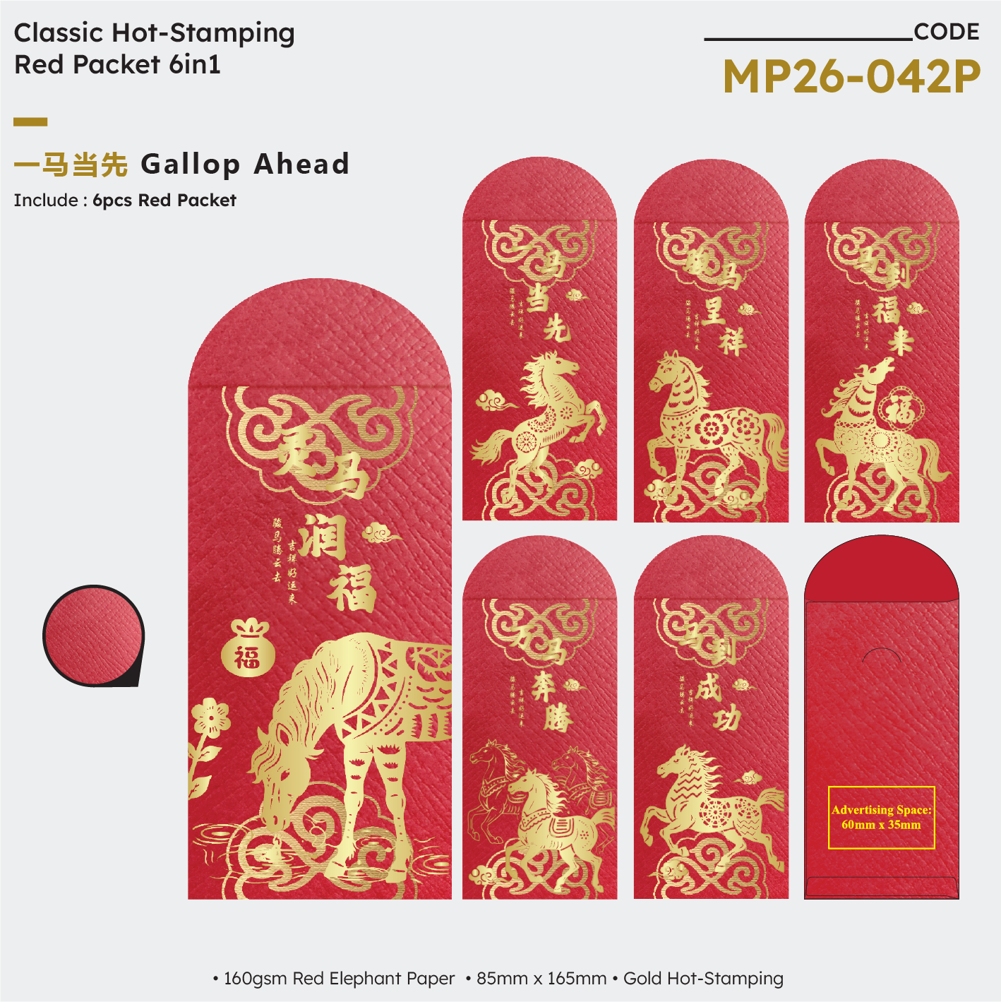 | MP26-042P Gallop Ahead 6in1 | NA | NA | NA | 160gsm Red Elephant Paper | Gold Hot-Stamping | 85mm (W) × 165mm (H) | 200 packets x 6 designs | 60mm (W) × 35mm (H) |