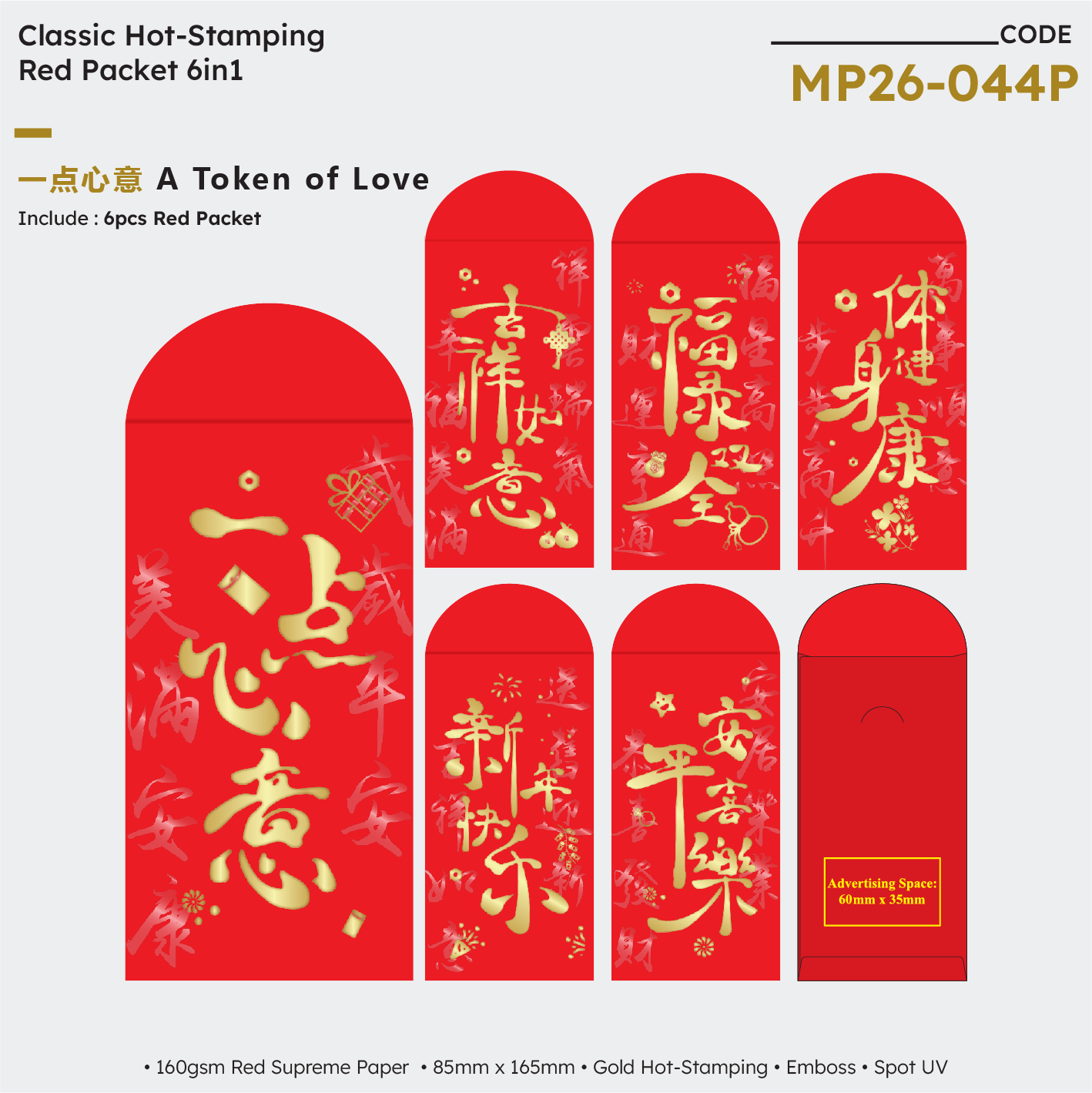 | MP26-044P A Token of Love 6in1 | NA | NA | NA | 160gsm Red Supreme Paper | Gold Hot-Stamping + Spot UV + Emboss | 85mm (W) × 165mm (H) | 200 packets x 6 designs | 60mm (W) × 35mm (H) |
