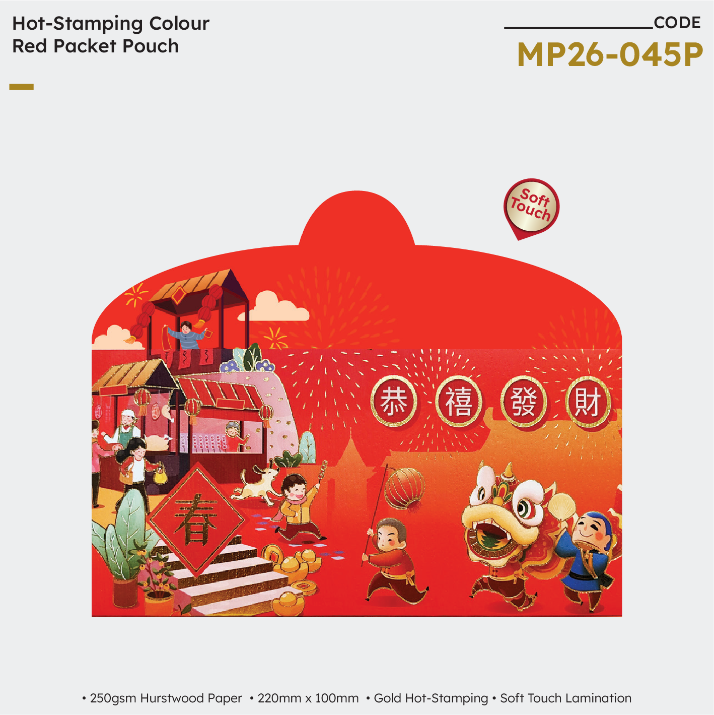 | MP26-028P Lucky Joy 4in1 | NA | NA | NA | 128gsm Art Paper | Soft Touch Lamination + Gold Hot-Stamping + Emboss | 85mm (W) x 165mm (H) | 200 packets x 4 designs | 60mm (W) × 35mm (H) |