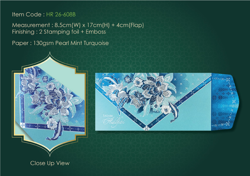 HR 26-608B130gsm Pearl Mint Turquoise8.5cm (W) x 17cm (H) + 4cm (Flap)2 Stamping Foil + Emboss5, 8, 10pcs per pack70mm x 50mm