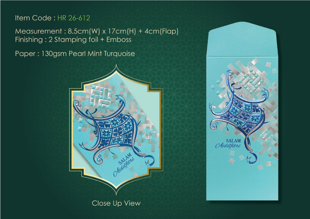 HR 26-612130gsm Pearl Mint Turquoise8.5cm (W) x 17cm (H) + 4cm (Flap)2 Stamping Foil + Emboss5, 8, 10pcs per pack70mm x 50mm