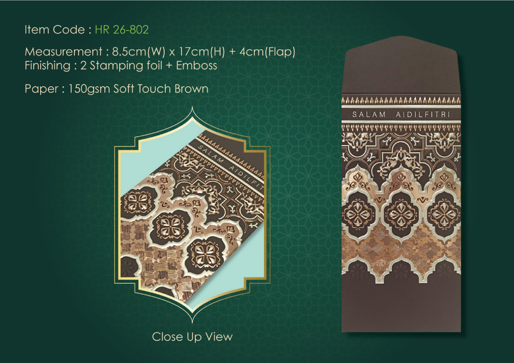 HR 26-802150gsm Soft Touch Brown8.5cm (W) x 17cm (H) + 4cm (Flap)2 Stamping Foil + Emboss5, 8, 10pcs per pack70mm x 50mm